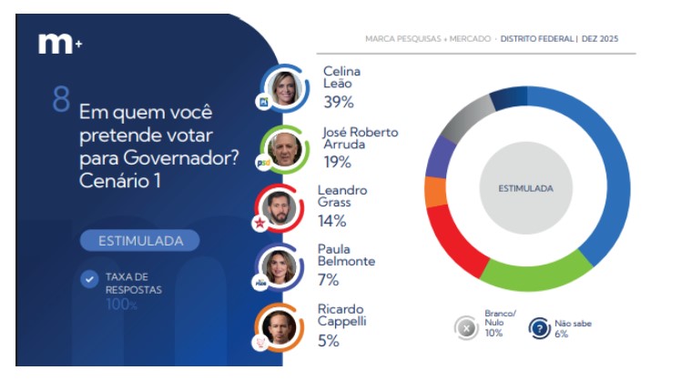 A disputa pelo Governo do Distrito Federal começa a ganhar contornos cada vez mais definidos. Levantamento eleitoral realizado pelo instituto Marca Pesquisas + Mercado, entre os dias 15 e 22 de Dezembro, mostra que a vice-governadora Celina Leão aparece com ampla vantagem sobre os concorrentes e, mantido o ritmo atual, reúne condições concretas de vencer a eleição ainda no primeiro turno.
