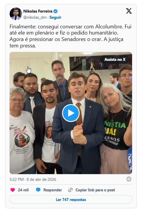 A clemência não é fraqueza, é a força de quem entende que a justiça sem compaixão se torna peso, mas a justiça com misericórdia devolve esperança, restaura vidas e lembra que, acima de qualquer disputa, existem pessoas, famílias e a dignidade que não pode ser esquecida”, escreveu Nikolas Ferreira (PL/MG) .