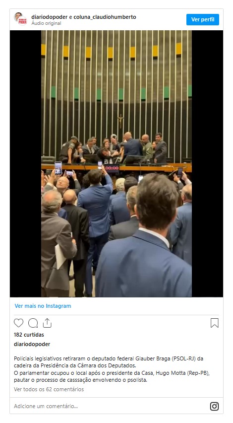 Policiais legislativos retiraram o deputado federal Glauber Braga (PSOL/RJ) da cadeira da Presidência da Câmara dos Deputados. O parlamentar ocupou o local após o presidente da Casa, Hugo Motta (Republicanos/PB), pautar o processo de cassação envolvendo o psolista. Os Policiais legislativos impediram a entrada de Jornalistas no local.