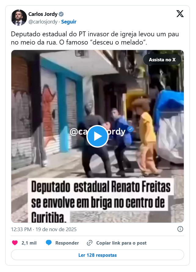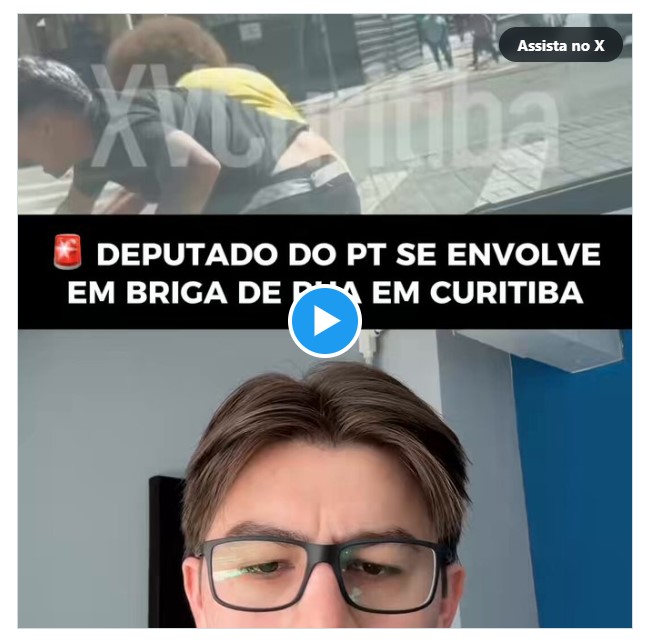 O deputado estadual Renato Freitas (PT/PR) foi flagrado em uma briga na quarta-feira (19) com outro homem no Centro de Curitiba (PR), na Rua Vicente Machado. Imagens e vídeos que circulam nas redes sociais, mostram os dois trocando socos e agarrões, com ferimentos visíveis no rosto de ambos.