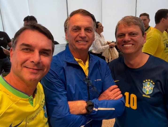 Flávio Bolsonaro (E), Jair Bolsonaro (C) e Tarcísio de Freitas (E)