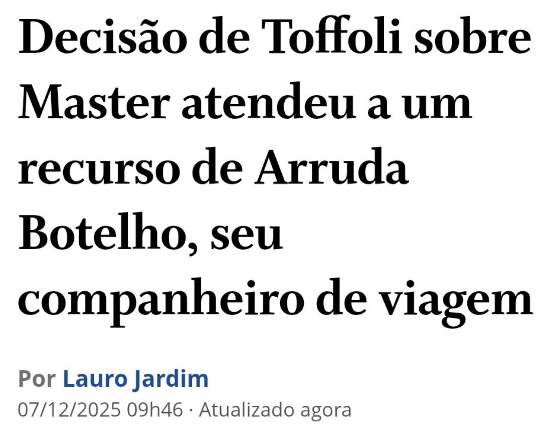 No mesmo voo estava o advogado Augusto Arruda Botelho, ex-secretário nacional de Justiça do governo Lula, que defende Luiz Antônio Bull, ex-diretor de Compliance do Banco Master, preso em operação da PF junto com o banqueiro Daniel Vorcaro.