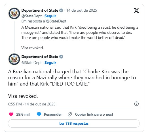 “Um cidadão brasileiro alegou que ‘Charlie Kirk foi o motivo de um comício nazista onde marcharam em sua homenagem’ e que Kirk ‘morreram tarde demais’. Visto revogado” disse o perfil oficial do Departamento de Estado na rede social ‘X’.
