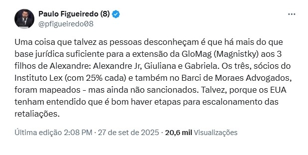 O aliado direto do deputado federal Eduardo Bolsonaro (PL/SP) nos Estados Unidos afirmou que os filhos de Moraes, “Alexandre Jr, Giuliana e Gabriela”, que constam como sócios do Instituto Lex, deverão ser alcançados pela Lei Global Magnitsky. Paulo Figueiredo, no entanto, sinalizou que há etapas na retaliação contra os detratores das liberdades no Brasil e seus pilares de sustentação.