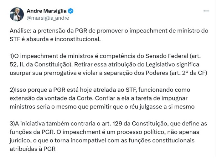 Em análise divulgada nesta segunda-feira (13), André Marsiglia afirmou que a competência para julgar pedidos de impeachment de ministros do STF é do Senado Federal, conforme o artigo 52, inciso II, da Constituição.