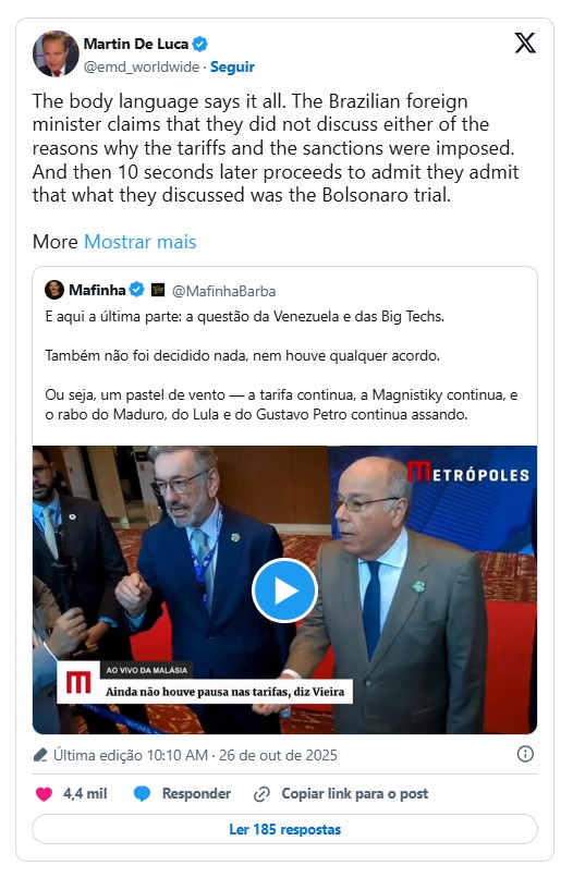 Em outra publicação, o advogado de Donald Trump interpreta como contraditória a linguagem corporal do ministro das Relações Exteriores, Mauro Vieira, e do secretário-executivo do Ministério do Desenvolvimento, Indústria, Comércio e Serviços, Márcio Rosa, ao negarem que não houve debate sobre a motivação política do tarifaço dos EUA contra produtos brasileiros.