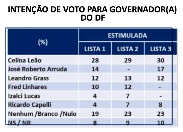 No cenário sem a candidatura de José Roberto Arruda, que deve ser barrado de concorrer nas eleições do ano que vem, Celina sobe para 29%, enquanto Grass (13%) e Linhares (12%) também crescem, assim como indecisos, brancos e nulos. O efeito é similar no terceiro cenário, sem Izalci Lucas e Linhares, no qual os demais candidatos também são beneficiados: Celina teria 30%, Arruda 17% e Grass, 12%, enquanto Capelli vai a 8%.