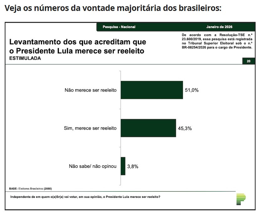 Levantamento nacional realizado pelo Paraná Pesquisas e divulgado na quinta-feira (29) revela que a maioria absoluta dos brasileiros, isto é, 51% dos entrevista consideram que Lula (PT) não merece ser reeleito presidente da República nas eleições de outubro próximo.