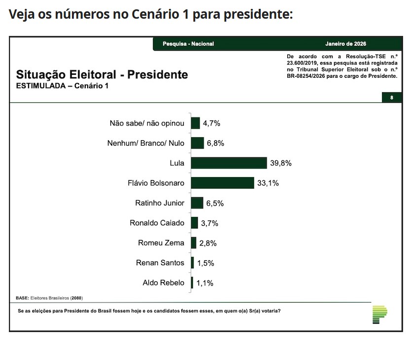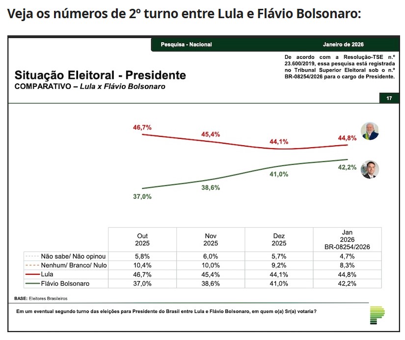 Em eventual segundo turno, caso a votação fosse realizada hoje, Lula somaria 44,8% contra 42,2% de Flávio Bolsonaro, que sobe em flecha desde que seu nome foi lançado. Em outubro, o filho de Jair Bolsonaro somava 37%, subiu para 38,6% em Novembro e para 41% em Novembro, para finalmente alcançar este desempenho de Janeiro.