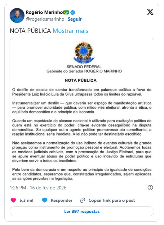 O senador Rogério Marinho (PL/RN), líder da oposição no Senado Federal, divulgou nota pública na segunda-feira (16) em que critica a suposta utilização de desfile de escola de samba como promoção política do presidente Lula.