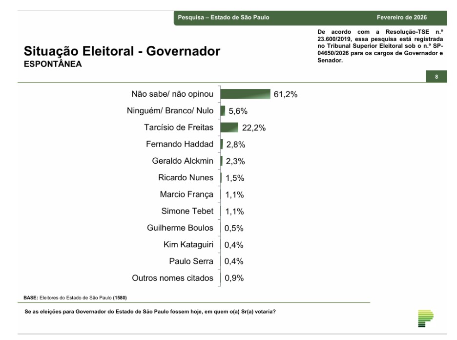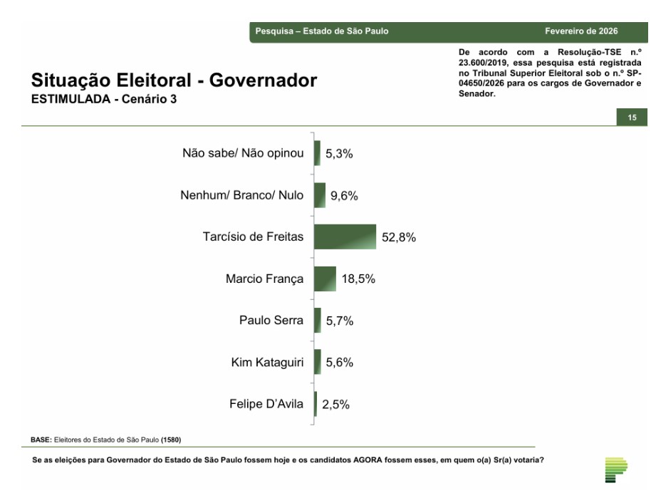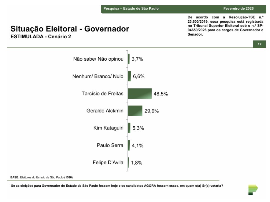 O levantamento da Paraná Pesquisas foi registrado no Tribunal Superior Eleitoral sob o n.º SP 04650/2026. E é resultado de entrevistas pessoais, domiciliares e presenciais, entre os dias 06 e 10 de fevereiro de 2026, com uma amostra de 1.580 eleitores, em 78 municípios paulistas. A pesquisa atinge um grau de confiança de 95,0% para uma margem estimada de erro de aproximadamente 2,5 pontos percentuais para os resultados gerais.